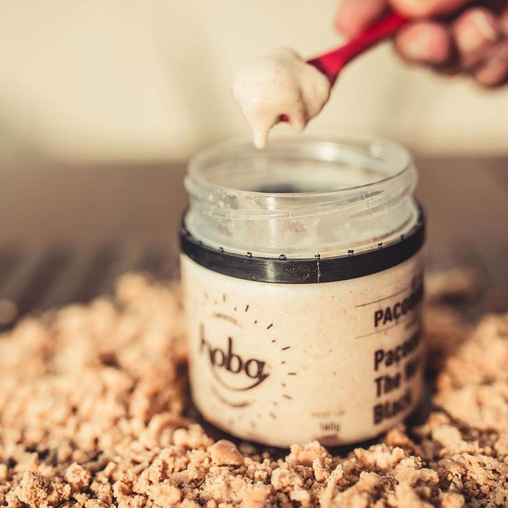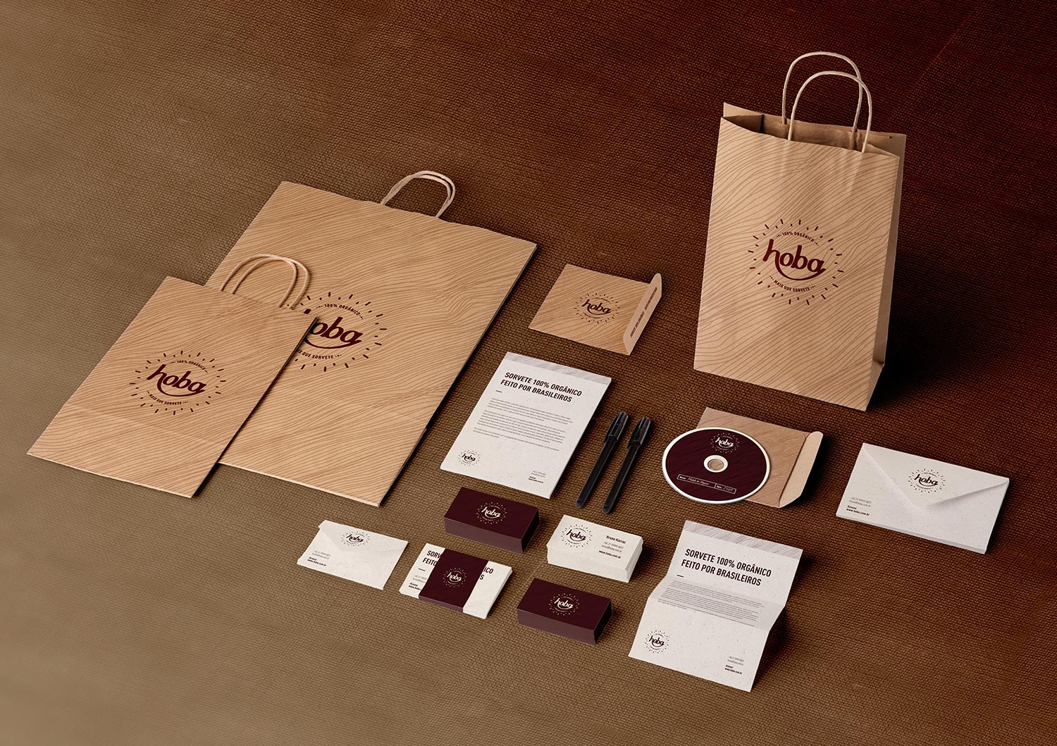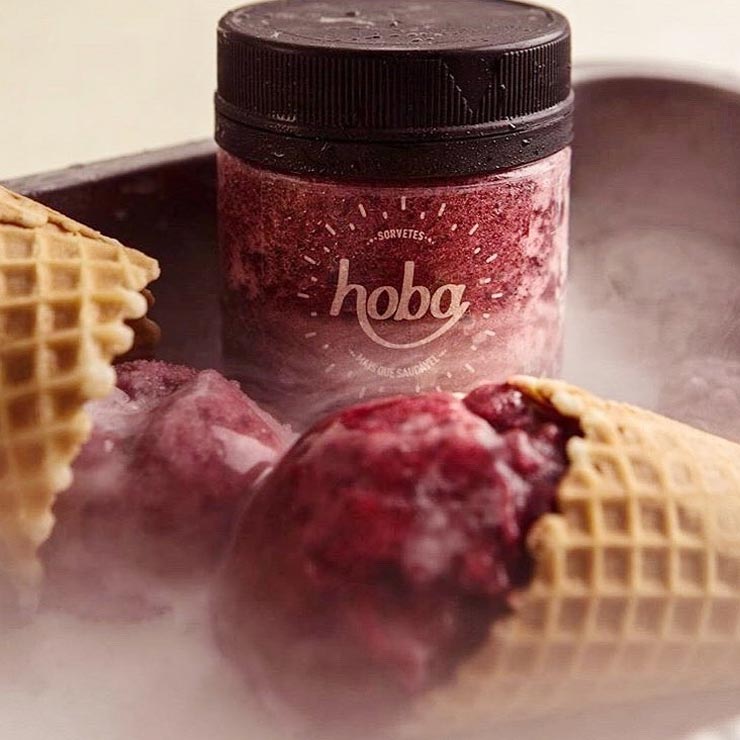Nome e identidade de marca. A Hoba produz sorvetes 100% veganos, com insumos de produtores locais e usa elementos da cultura brasileira para, por exemplo, batizar os sabores dos seus sorvetes (paçoquinha).